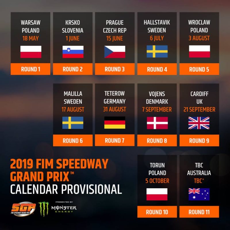 Promotéři Speedway Grand Prix, anglická společnost BSI, s novinkami ohledně další sezóny nešetří. Poté co zveřejnili jména divokých karet a náhradníku, spatřil světlo světa i kalendář závodů na rok 2019. Jedná se o předběžnou verzi a tak je možné, že se do startu další sezóny ještě něco změní.