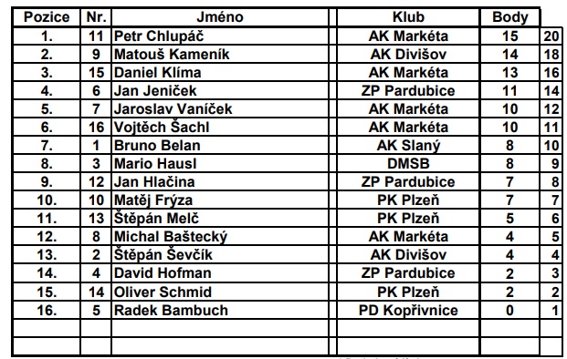 Dařilo se Matouši Kameníkovi, který ztratil na vítěze pouhý jeden bod a dokázal udolat v šestnácté jízdě i zkušenějšího Klímu. Nyní se drží na třetím místě v celkovém pořadí, se ztrátou pouhých 4 bodů na vedoucí Pražany. Konečné slovo však neřekli určitě ani Jaroslav Vaníček a Jan Jeníček.