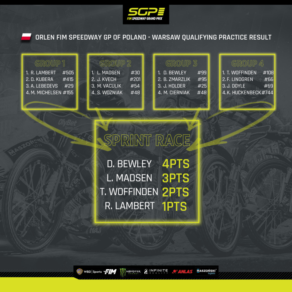 Včerejší odpoledne v PGE Narodowy ve Varšavě patřilo bodovanému tréninku. Ten se nejlépe povedl Danu Bewleymu. Ale ani Jan Kvěch neměl špatný výsledek, skončil na šestém místě a symbolicky si vybral i šestou startovní pozici.